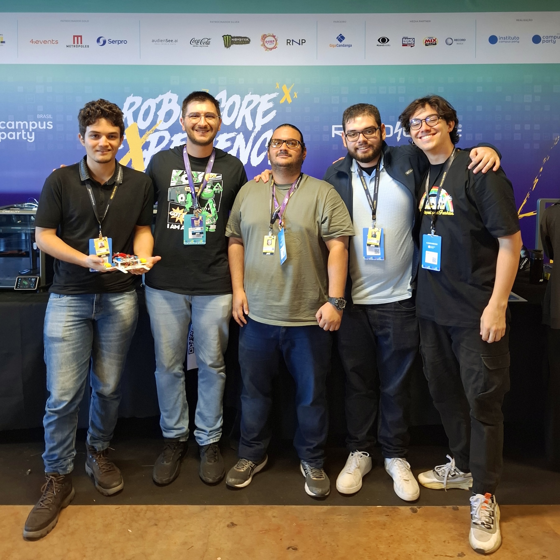 Robocore Experience 2025 (da esquerda para direita): Davi Barbosa, Victor Pruner (Creality 3D),Diogo Lacerda,Mateus Carlini e João F.França.