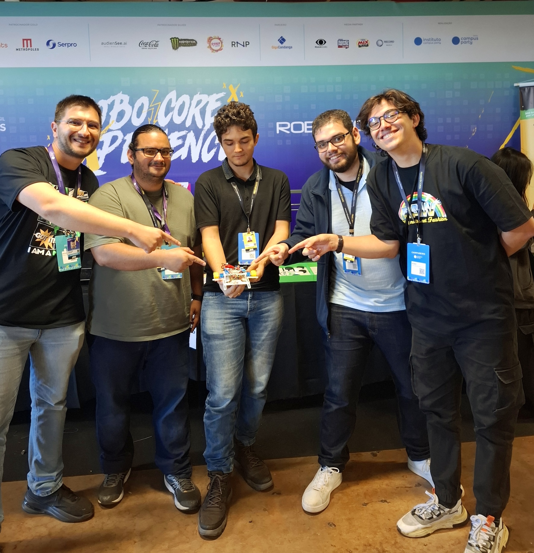 Robocore Experience 2025 (da esquerda para direita): Davi Barbosa, Victor Pruner (Creality 3D),Diogo Lacerda,Mateus Carlini e João F.França.